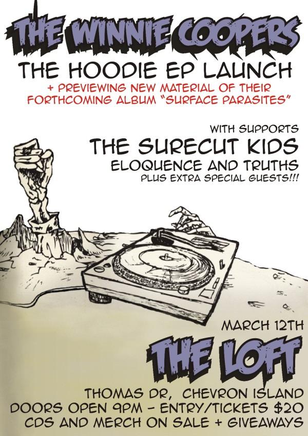 Calling in the renowned services of ARIA award-winning Brisbane producer Magoo (TZU, Regurgitator and Midnight Oil to name a few) and with guest spots from the indefinable pop songstress Kate Miler-Heidke and the mischievous cult hero emcee Evil Eddie (Butterfingers), this album bleeds Queenslander maroon. With their hearts on their sleeves, and with nods to those they have toured with, The Beastie Boys, Michael Franti and Ugly Duckling, this is the Winnie Coopers at their humorous and thought-provoking best. After saying farewell to drummer/producer Fingers Malone, the Winnie’s have acquired the skills of Captain James Crook, who has not only taken up the rhythm reins, but has also played various instruments on the latest long player. Once again the lines between hip-hop, rock and reggae are blurred with sugary-sweet harmonies and infectious hooks as the Coopers make fun of the industry, the haters but above all themselves. Following up the lauded Worth the Weight (2008) (Rolling Stone 3 ½ stars) and the Triple J favourite Being Different which featured Success, Surface Parasites is sure to get tongues wagging and heads nodding again. Until the release, which is set for sometime later in the year, the Coopers are set to drop The Hoodie EP. The launch of this EP will be happening at The Loft, March 12. Supports are from The Surecut Kids, Eloquence and Truths plus special extra guests. Doors open at 9, with the price being $20 for entry. CD and merch on sale.