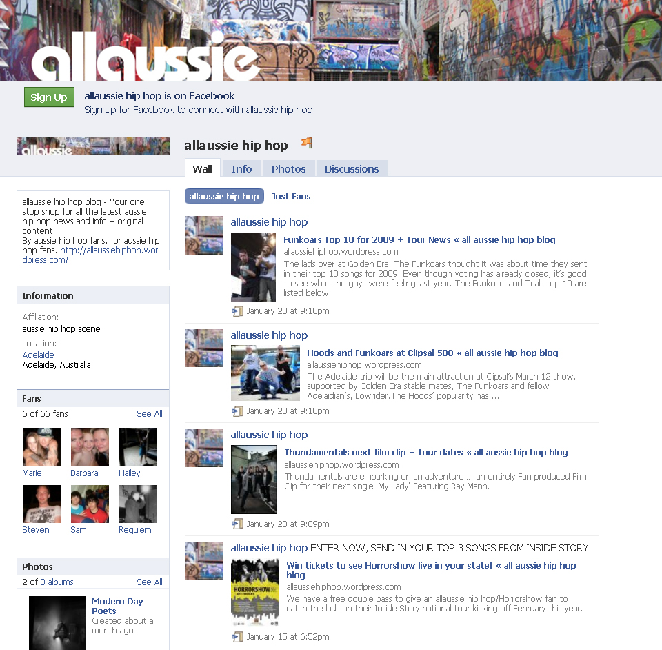 Here it is people, the official allaussie hip hop facebook fanpage – A clever way to keep up to date with all your Australian Hip Hop news and events. Share posts that we throw up with your friends, get them to gigs and send in your live concert pics for us to post in the live gig album. All of this is waiting for you to become a fan of, right here at the allaussie hip hop fanpage. Tell your friends and use the short link here to do it with: http://tiny.cc/uyMCR