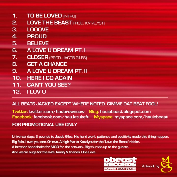 To kick off this corporate day of love, Hau from Koolism is celebrating with a free mixtape for all ‘Love the Beast’. Named after the Eric Bana doco, it’s bits and pieces Hau’s been working on, with original beats and other people’s instrumentals. Jacob Giles helped Hau put this one together but we also see a track produced by Katalyst (Space Invaders) and MGO on the artwork (Obeast Records ‘Badder Than Osama’….classic!). To grab this banging mixtape click here.