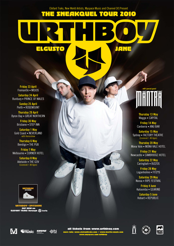 In the name of late nights and lost mornings, Urthboy is coming to your town on the Sneakquel Tour throughout April and May 2010. Nominated for this year’s Australian Music Prize (one of the only artists nominated twice) Urthboy is joined on stage by the incandescent Jane Tyrrell and DJ/producer Elgusto.