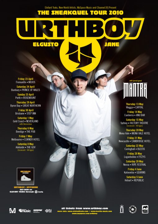 In the name of late nights and lost mornings, Urthboy is coming to your town on the Sneakquel Tour throughout April and May 2010. Nominated for this year’s Australian Music Prize (one of the only artists nominated twice) Urthboy is joined on stage by the incandescent Jane Tyrrell and DJ/producer Elgusto.