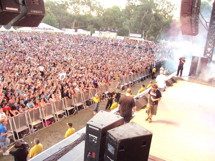 The ARIA-award winning group, who have two previous Australian number one albums to their credit, are also keen motor sport fans and were understandably thrilled following their rides. The Funkoars, Lowrider and The Midnight Juggernauts also played on the night, with thousands of fans packing out the Clipsal track in anticipation of one spectacular event. Punters were not disappointed, the sound was ear deafening, (at least a 20 dB louder than the AC/DC), the crowd was pumped and The Hoods were set to deliver….