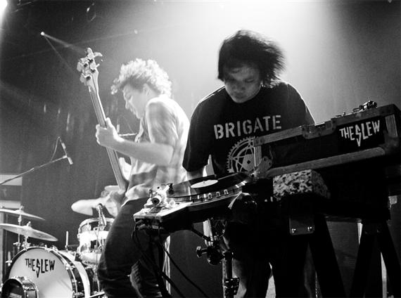 Teaming up with Chris Ross and Myles Heskett – the former rhythm section of Grammy Award-winning band Wolfmother – The Slew set out to put together a full-blown rock band experience to do justice to the material in a live setting. And justice was served: The truly excessive six turntables, drum, bass, keyboard and wall of amps that made their way across North America this October made for a full-on raw, pummeling rock experience. T