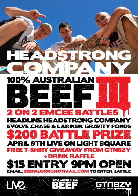 The next installment of 100% Australian Beef will go down on April 9 at L!ve on light square. You can also catch Headstrong Company, Evolve, Chase & Lariken plus Gravity Ponds performing on the night. The 2 on 2 emcee battle will have $200 and a prize pack up for grabs. To enter check the details below.