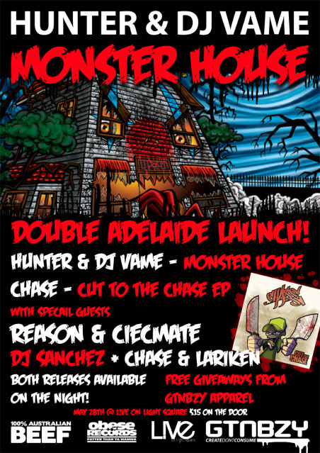 Hunter and DJ Vame will launch Moster House in Adelaide on May 28th at an 18+ show. This will be held at L!ve on light square. The gig will feature Reason & Ciecmate and also Chase’ – Cut To The Chase EP launch featuring Lariken and DJ sets.The Cut To The Chase EP available from merch table on the night, buy one and get it signed at the end of the night.