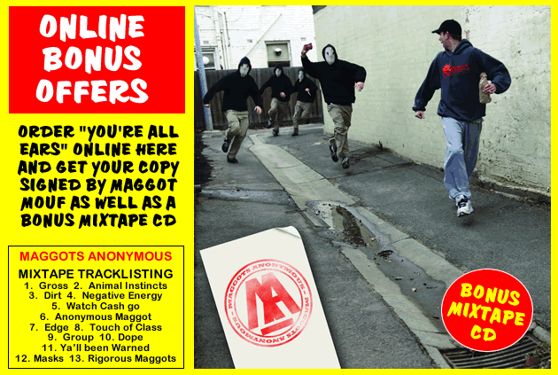 In 2005 Maggot Mouf relocated to Melbourne and met up with old Canberra counterparts, the Hospice Crew, which saw the recording of Read ‘Em and Weap. The song made it to the monolithic Visiting Hours project, and Maggot Mouf has since scooped up beats and worked on projects with numerous Hospice members and Melbourne locals. You’re All Ears features guest spots by Dekoda, 1/6 and Scotty Hinds. Production by Joey Gargoyle, Ciecmate, C-Rodent, Mizari, Bigfoot, Must And Sammy Scissors. Cuts by DJ Paypercutts, DJ Buick, and Sammy Scissors.