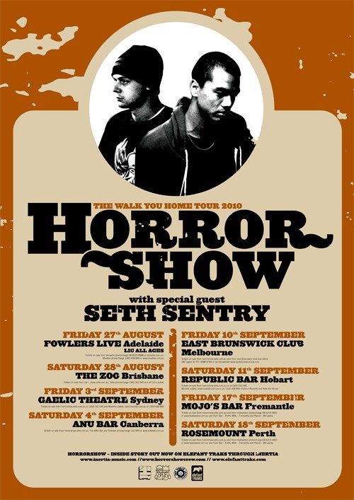 The buzz around Horrorshow keeps growing: their evocative, ego-free hip-hop continues to strike a chord with a diverse and growing legion of devoted fans. They were recently featured in J-MAG for the tattoos fans have made out of their lyrics. After appearances supporting Hilltop Hoods in England and Germany (July check below), as well as a spot on the sold out Splendour In The Grass, Horrorshow will be perfectly prepared for a thrilling tour to complete an amazing run since their Inside Story album came out in 2009.