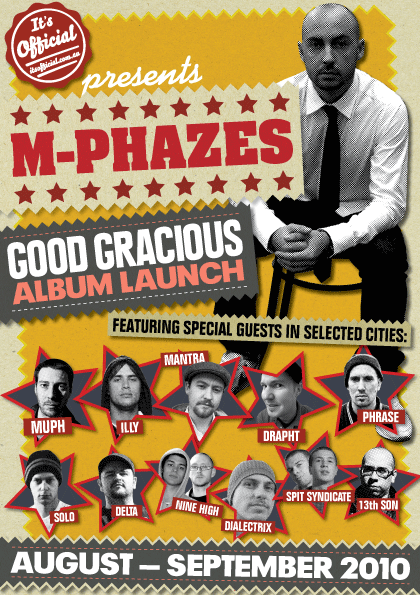 After spending two long years crafting his masterpiece, M-Phazes released his debut album Good Gracious to critical acclaim, debuting at #20 on the Aria charts and #1 on the independent AIR charts. M-Phazes has proven himself a production force to be reckoned with having produced tracks on almost every major Australian release in the last few years (Bliss N Eso, Phrase, Drapht etc) and landing placements with a who’s who of the US music industry (Pharoahe Monch, Amerie, M.O.P. etc).