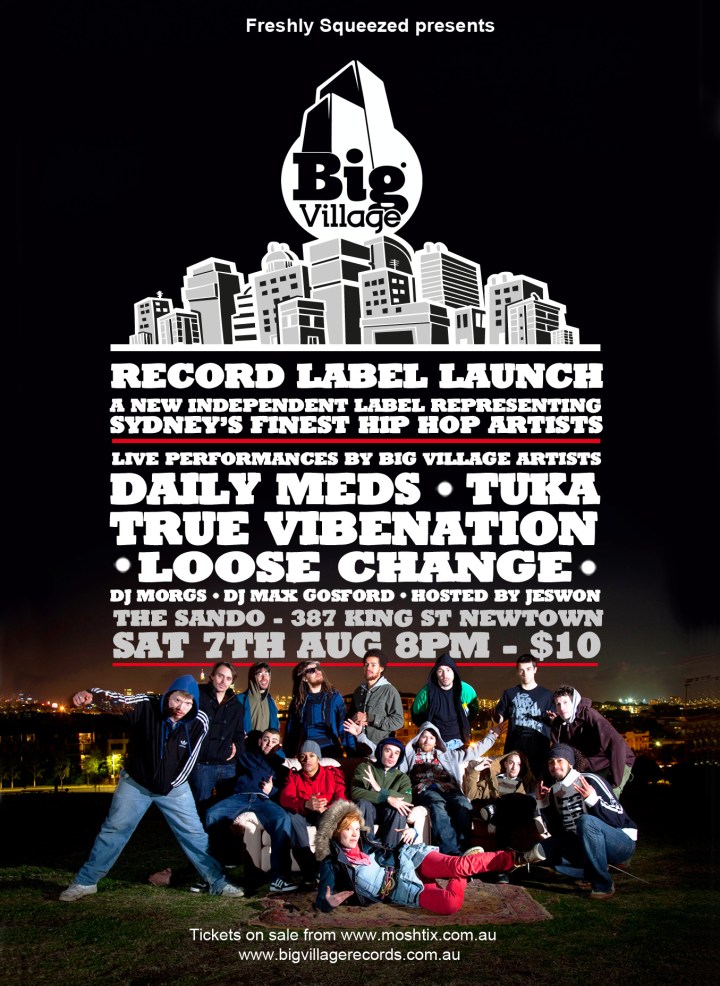 Performing on the night will be the full Big Village stable, consisting of Daily Meds, Loose Change, True Vibenation, Tuka (Thundamentals), DJ Max Gosford, DJ Morgs and hosted by Jeswon. The label was founded by the artists it represents and members of all the groups contribute their expertise to the running of the organisation. With True Vibenation, Loose Change and Daily Meds already having released projects under the Big Village banner, 2010 will continue to see more high quality releases from the BV stable including a Big Village mixtape and debut solo albums from Tuka (Thundamentals) and Ellesquire (Loose Change).