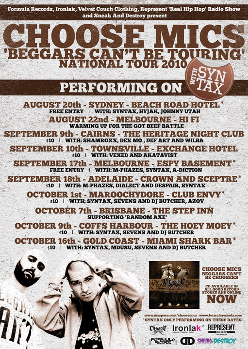 Choose Mics will be joined by Syntax, who will be performing new joints off his forth coming album The Musical (preview here) and A-Diction who will be shortly releasing their LP Walkin Alone (details here). Beat master M-Phazes will also be on hand spinning tracks in between sets.