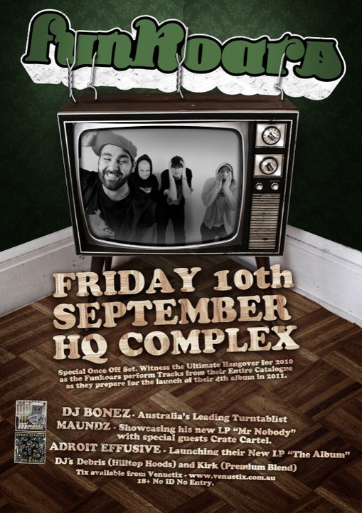 Helping The Funkoars deliver the best show of 2010 will be Adelaide’s own Adroit Effusive, launching their brand new album The Album plus Melbourne guests Maundz with Crate Cartel AND a very special performance from the legendary DJ Bonez. On hosting duties is K21 and lest we forget, sealing the SA deal is local DJ’s Debris (Hilltop Hoods) & Kirk (Premium Blend)!