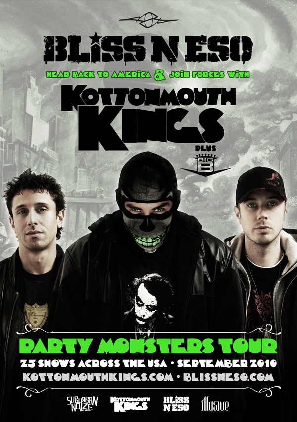 By popular demand Bliss n Eso return to America with their explosive live show and join forces with the Kottonmouth Kings for the Party Monsters Tour! The US tour kicks off in Dallas on August 28th and whirlwinds through 25 cities in less than a month before finishing in Kansas City on September 25th.