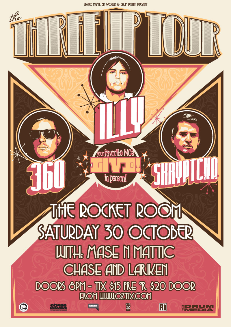 Showcasing three of the country’s most talented emcees, the nationwide Three Up Tour brings Illy, 360 and Skryptcha to cities and towns across Australia starting this September. Fresh from the success of his Triple J Hottest 100 listed single (#66) Pictures and stints on the most recent Groovin’ The Moo festival, Illy is set to showcase hits from his debut album Long Story Short alongside brand new tracks from his much anticipated… second album The Chase. Slated to hit stores later this year via Obese Records, the Three Up Tour will be your first opportunity to hear his latest material.