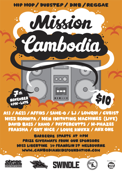 Sunday November 7th will see some of Melbourne’s most talented DJ’s and artists joining together at Miss Libertine for a massive day of bass, barbeque and beats in support of The Cambodian Kids Foundation. With two rooms covering hip hop, dubstep, reggae and DnB as well as a barbeque on the balcony and giveaways from our sponsors, it’s sure to be a great day, so come get ya skank on and in doing so help contribute towards some less fortunate others at the same time. In late November three people will be heading over to Cambodia as part of the Cambodian Kids Foundation (CKF) to spend some time with the kids and in doing treating them for head lice, scabies, worms and taking them out on day trips amongst other activities. All proceeds raised from this event will go towards the CKF and in particular this trip in November.