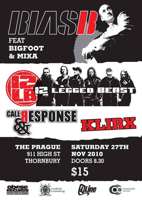 For the legion of Melbourne Hip Hop heads that support Australian Hip Hop music, rapper Bias B needs no introduction. Bias B headlines a night of local talent on Saturday November 27th @ The Prague – 911 High Street Northcote. Support comes from 12 Legged Beast, Call & Response and Klirx. Expect a big night of hard beats and rhymes with giveaways from 1line.com.au $15 on the door.