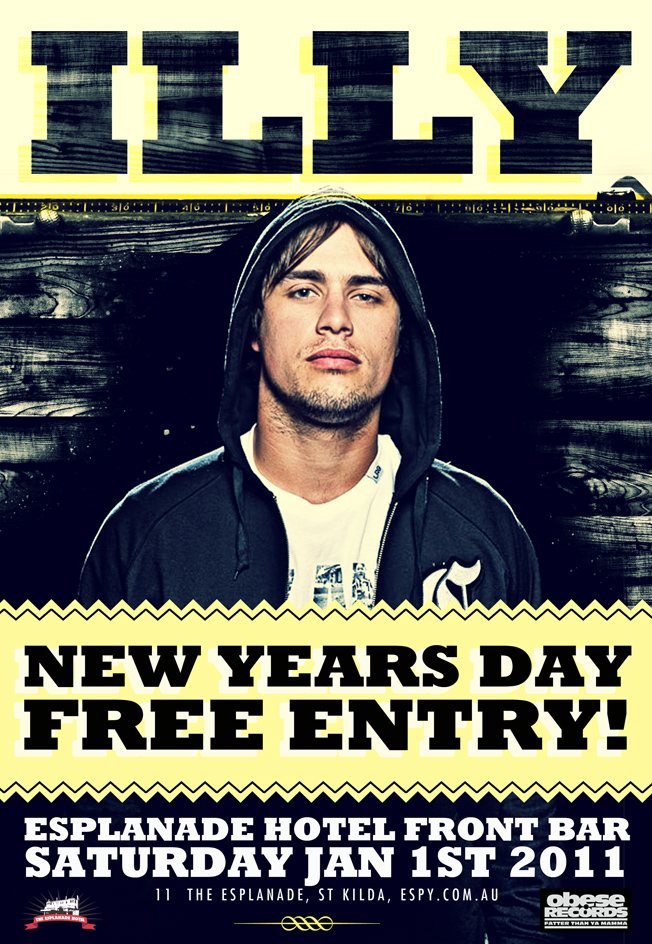 After touring nationally on the Groovin The Moo Festival and performing sell out shows around the country, Melbourne’s own Illy is primed to kick off 2011 with a one-off show in the Espy Front Bar on New Year’s Day. Also kicking it in the front bar will be Briggs, 360, M-Phazes and Manchild.
