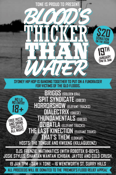 GigTone is proud to present: Blood’s Thicker Than, Water (Sydney Hip Hop QLD Floods Relief Gig) Wednesday 19th January @ Tone. Sydney’s Hip Hop elite has banded together to hold a fundraiser for victims of the Queensland Floods – some of which have family or friends directly affected, and everyone jumped at the chance to help out. Blood’s Thicker Than Water will feature a special appearance from Melbourne’s Briggs (Golden Era) and a stellar line-up of Sydney hip hop acts including Ozi Batla (Elefant Traks), Spit Syndicate (Obese), The Tongue (Elefant Traks), Dialectrix (Obese), That’s Them, The Last Kinection (Elefant Traks) and more to be announced over the coming days. DJs Frenzie, Josie Styles, Jaytee, Cold Crush, Mathmatics & Shantan Wantan Ichiban will be rocking the dancefloor alongside Robotek B-Boys and a few surprise guest DJs.