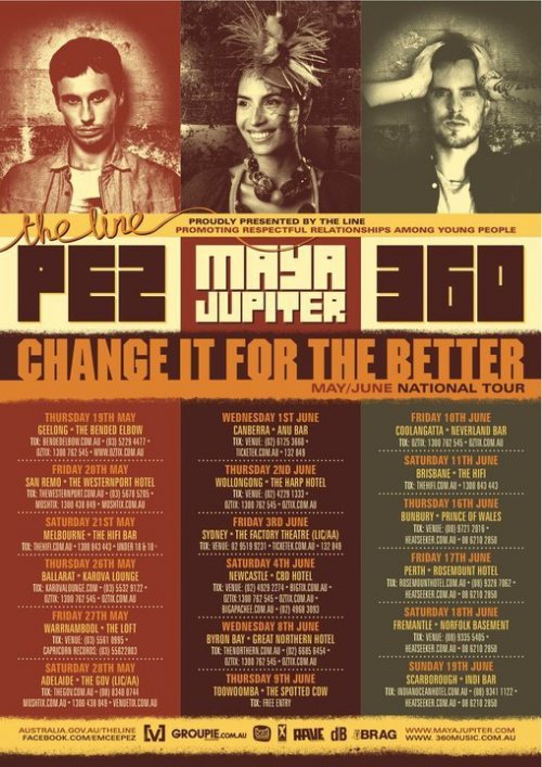 Pez, 360 and the lovely Maya Jupiter are hitting the road in May/June, in support of The Line – promoting respectful relationships among young people. Pez will be performing with a full band so this is one tour not to be missed! Ticketing details are on the poster, or you can find more info here.