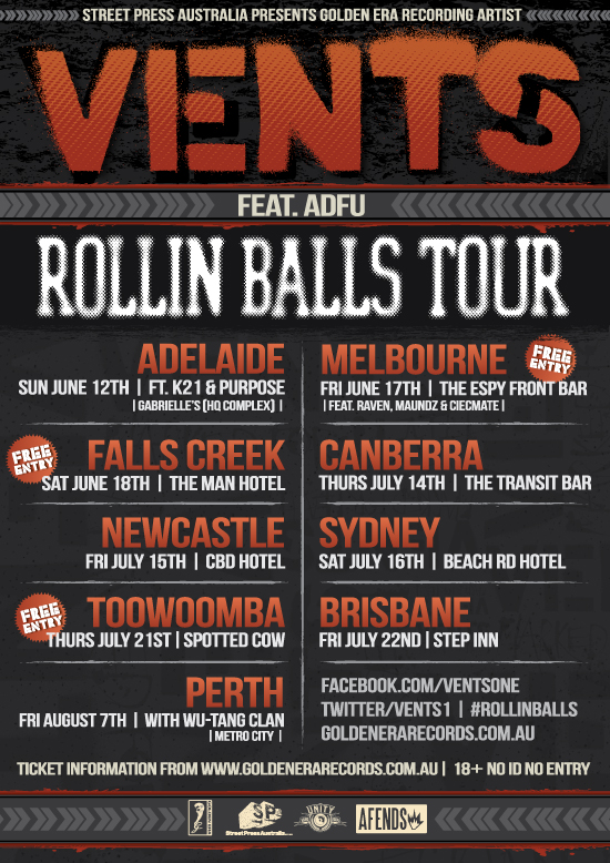 An imposing live performer Vents has toured nationally with Funkoars, and most recently Hilltop Hoods. In 2007 Vents enjoyed a level of mainstream success with his debut album Hard To Kill. The track Love Song was picked up by Triple j and in the following years he toured extensively, playing festivals such as Big Day Out, Homebake, Summadayze, One Movement and Groove is in the Park. May 13th this year saw Vents release his sophomore album Marked For Death, once again enlisting Trials of the Funkoars to handle production duties. Trials has recently experienced a huge amount of success behind the boards – producing Drapht’s platinum single Rapunzel and working with Ash Grunwald, Hilltop Hoods, Abbe May as well as countless others. Gifted newcomer, ADFU comes on board to complete the team. Label mates Sesta & Hilltop Hoods add guest vocals to the album supplying another dimension to the project. Since releasing Hard To Kill in 2007, a loyal following has eagerly anticipated his next release. An extended hiatus hasn’t tarnished Vents’ standing with Hip Hop fans; in fact it’s fed the anticipation. Four years on, Marked For Death serves at the big brother to his debut release, with a more mature, introspective, sometimes cynical but always honest view of the world, that is both unique and entirely relatable. The first single History Of The World has garnered airplay across the country with support on both independent radio and national broadcaster Triple j, heralding exciting times ahead for Vents in 2011.