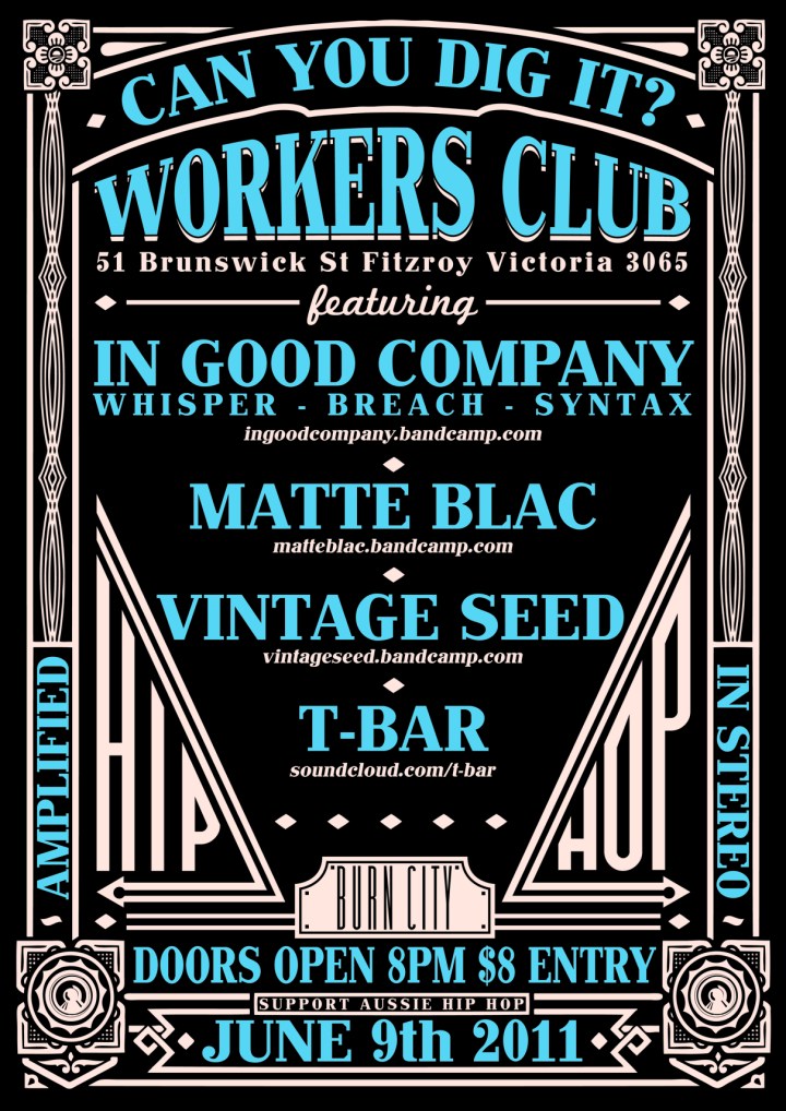 Head on down to The Workers Club for Can You Dig It? Hip Hop Showcase in Melbourne this Thursday night. Featuring: In Good Company (Whisper. Syntax, Breach), Matte Blac, Vintage Seed & T-Bar. This is going to be a massive night, so head down for some of the freshest hip hop in Melbourne.