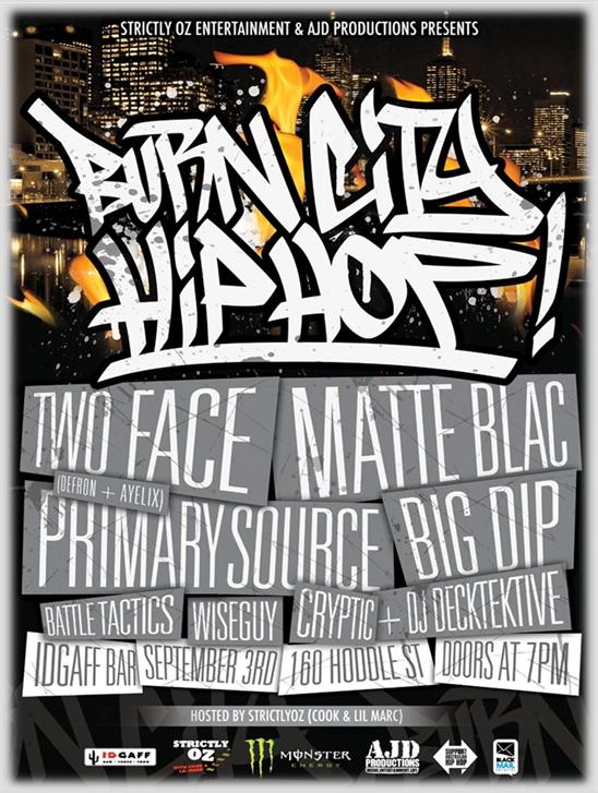 Matte Blac will be giving us some tracks from his recent Mixtape Mixed Business, Defron often known for his Battle talents steps to the stage with his man Ayelix to form Two Face, who are set to tear up the stage. Cryptic also known for his Battle MC abilities will perform new tracks from his upcoming EP and plenty more including Big Dip, Primary Source & more on the night. The girls of Monster Energy Drinks will be there on site giving away Monster Energy Products. The night is hosted by none other than Cook & Lil Marc of StrictlyOZ Hip Hop show.