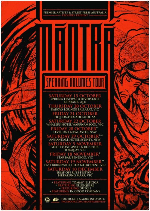 Production-wise, the album boasts a stylistically diverse selection of sounds; each producer bringing his own realm of sonic brilliance to the fore. Speaking Volumes credits beats from the likes of M-Phazes, El Gusto and Mista Savona among others. To celebrate the release of what is sure to be one of the Australian Hip-Hop releases of the year, Mantra is hitting the road with a brand new live show. Widely regarded as one of the best live performers in the country, he will be performing tracks off the new album, as well as some old favourites.