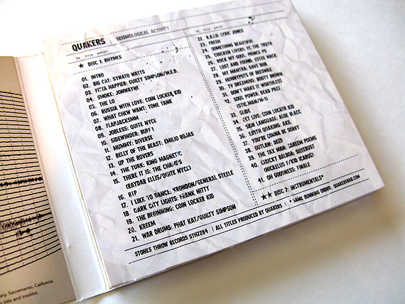 This months aahh album art award has to go to the Quakers CD. Featuring a beautiful 2 CD layout and killer design, the cover could have been a nightmare with the 40+ track list, instead we have all the artists layed out on the back with an easy to read tracklist on the inside fold out. If you want to check out more download the Hip-Hop Quake Mix by Katalyst, a 40-minute set featuring some of the work that has inspired the project. You can get that from iTunes here or the Stones Throw RSS feed here. More information on that can be found here.