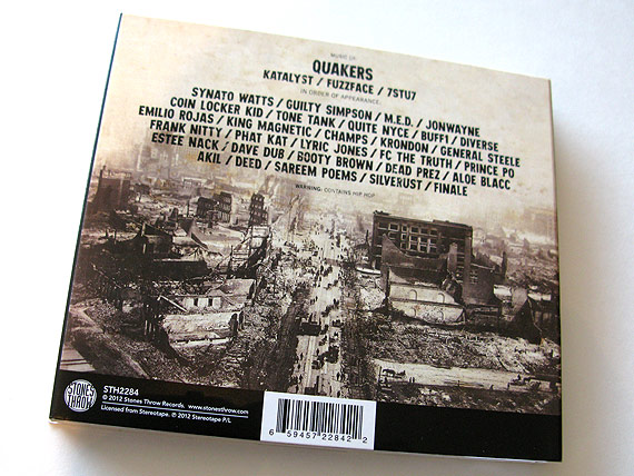 Quakers consists of local beatmaster Katalyst, Fuzzface (a.k.a. Portishead‘s Geoff Barrow), and 7-Stu-7, a triage of venerable producers in their own right whose combined efforts prove boom-bap is far from dead. Fuzzface is better known as Portishead’s Geoff Barrow, a long-time Stones Throw supporter in touch with Peanut Butter Wolf since championing the Jaylib album back in 2004. 7-Stu-7 is Portishead’s engineer and in-house producer at Invada Records in the UK. Katalyst is one of the most respected producers in Australia and a partner in Invada Records.