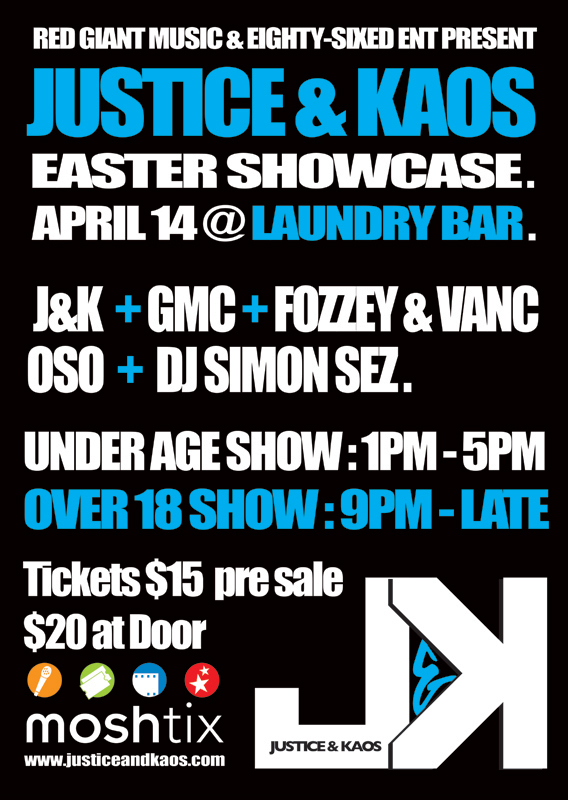 Justice & Kaos bring the Easter Showcase to the Laundry Bar for a one-off event with J&K, Fozzey & VanC, GMC and DJ Simon Sez on the lineup. We have 3 double passes to hook up 3 lucky U18 readers and their friends + 2 double passes to our 18+ readers and their friends. All you have to do to enter is send your name, phone number and answer to the question below to allaussiescomps@gmail.com.