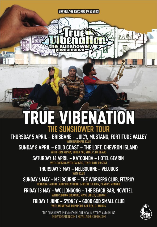 True Vibenation goes beyond the live hip hop format of two turntables and a microphone for a show that sees them transform into a blasting horn section and live beatmaking band. The trio has been going from strength to strength since the release of their debut album The Sunshower Phenomenon through Big Village Records in late 2011 and is now ready to take their infectious live show on the road with The Sunshower Tour over April/May/June.