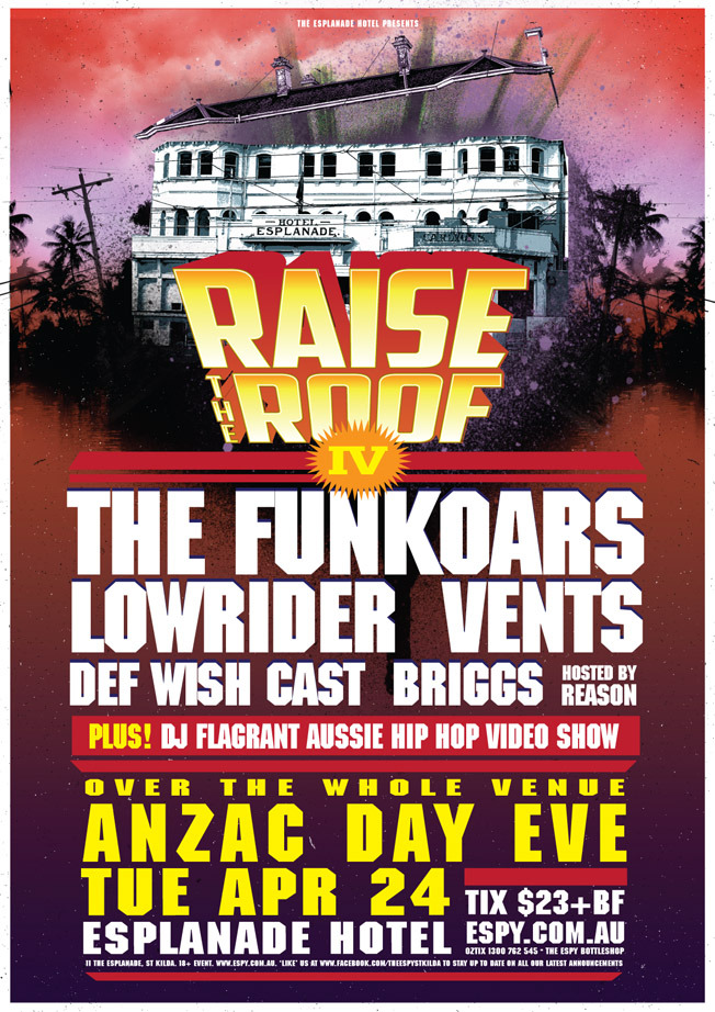 Featuring Funkoars, Lowrider, Vents, Def Wish Cast, Briggs, Mase & Mattic, Purpose, Death Stars, DJ Reflux, Remi, Eloquor, Soliloquy, Mu-Gen, Prequel, Slap618 and DJ Flagrant’s Aussie Hip Hop video show. Hosted by Reason, Raise The Roof IV will be held at the Esplanade Hotel, April 24. Tix are available now. You do not want to miss this one Melbourne.