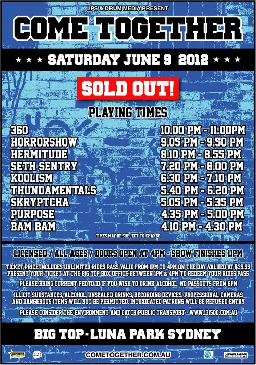 Not to say the roof won’t be raised from opening doors, with Bam Bam kicking off the ceremonies, shortly followed by Purpose, with some very special guest performers. We’ve been sworn to secrecy – but organisers suggest you get there early, as this is one performance not to miss! The rest of the day and night will unfold with the cream of local hip hop, Skryptcha, Thundamentals, Koolism, Seth Sentry, plus Elefant Trak madness with Hermitude and Horrorshow.