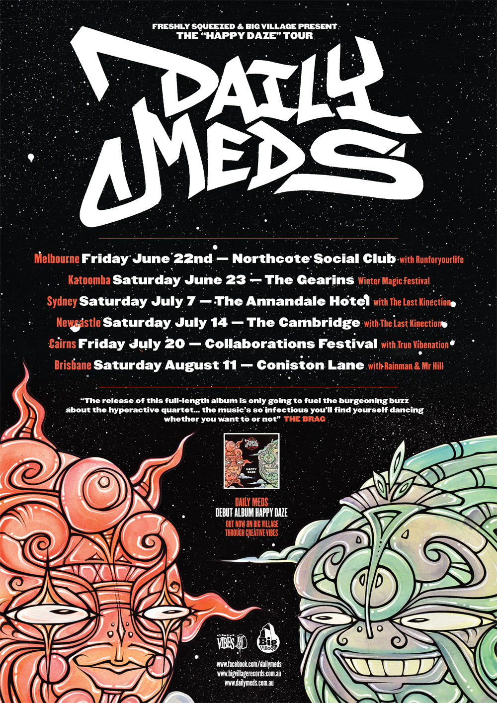 Subsequent to this overwhelming support, Daily Meds are embarking on their first east coast tour, showcasing their high energy, intense live show alongside some of Australia’s finest hip hop artists. The Happy Daze tour is set to show the rest of the country why Daily Meds have earned so much hype.