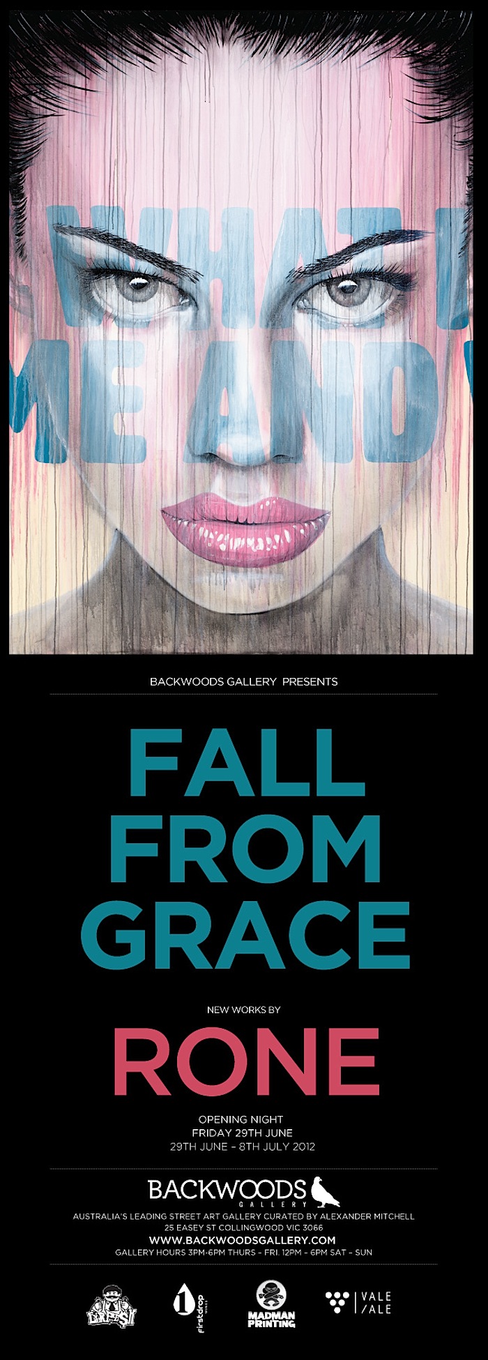Best known for the distinctive female centrepieces of his paste ups and murals on the walls of Melbourne, globetrotting street artist Rone returns to his home town for his first local show of 2012 in the more conventional surroundings of Collingwood’s Backwoods Gallery. Fall from Grace sees Rone continue to showcase his female muse, but in a different light across 12 new works – four on canvas (including one triptych), four on brick and four on paper, all peeled, tattered and aged to reflect the outdoor environment he’s accustomed to working in.