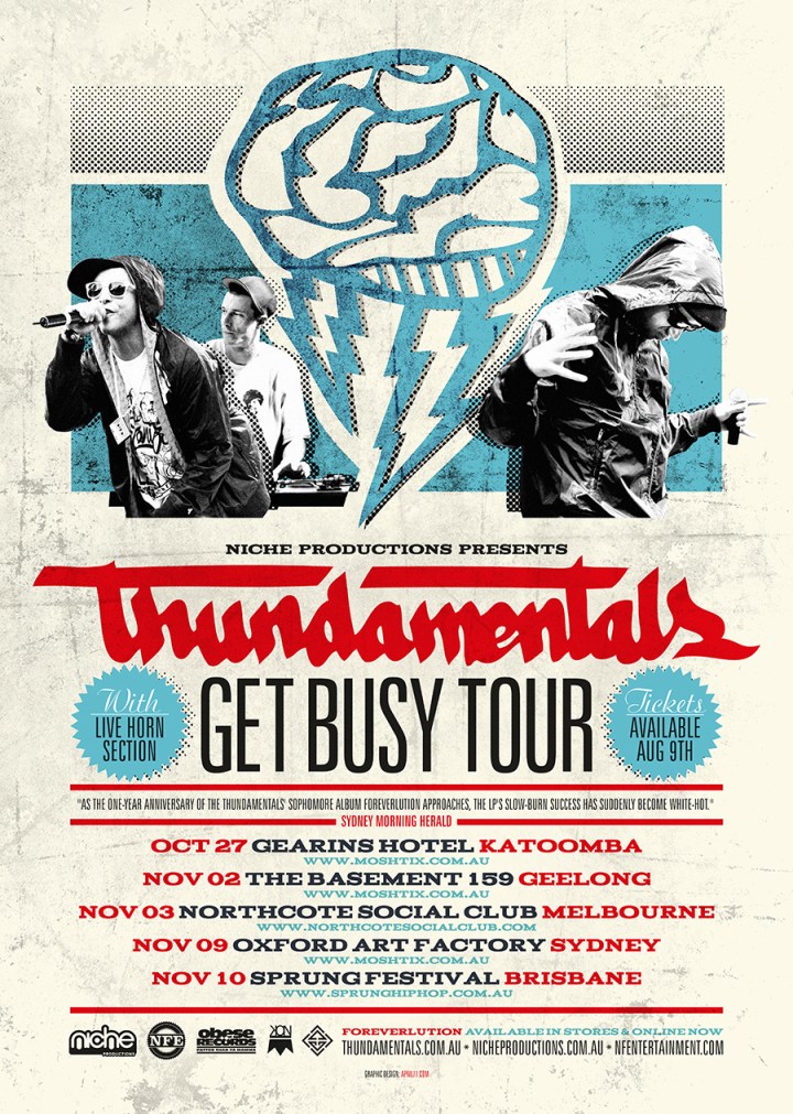 Tickets for all shows go on sale to the public today. There will be a free MP3 of an exclusive new Thundamentals track with every ticket purchased for the Sydney, Melbourne and Blue Mountains shows.
