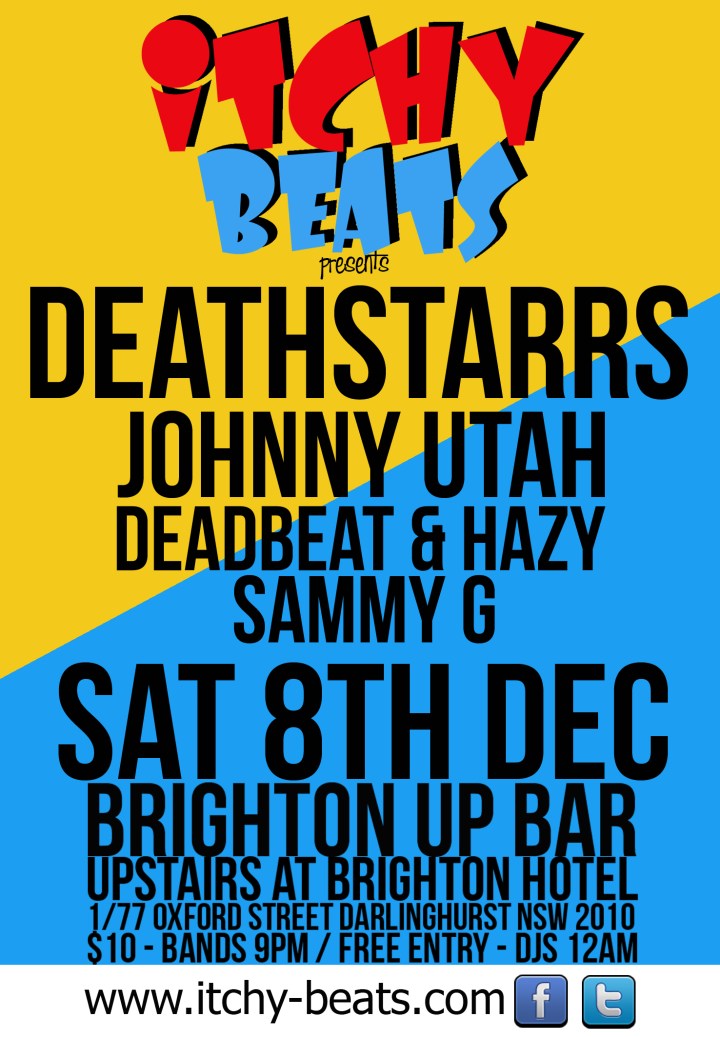 The next Itchy Beats will be headlined by DeathStarrs. With the help of their two latest singles Immortal and Take It Or Leave receiving national airplay on triple j, the Gold Coast duo went to Brisbane to appear at the Sprung Hip Hop Festival 2012, alongside Hilltop Hoods, Seth Sentry, Illy and more.