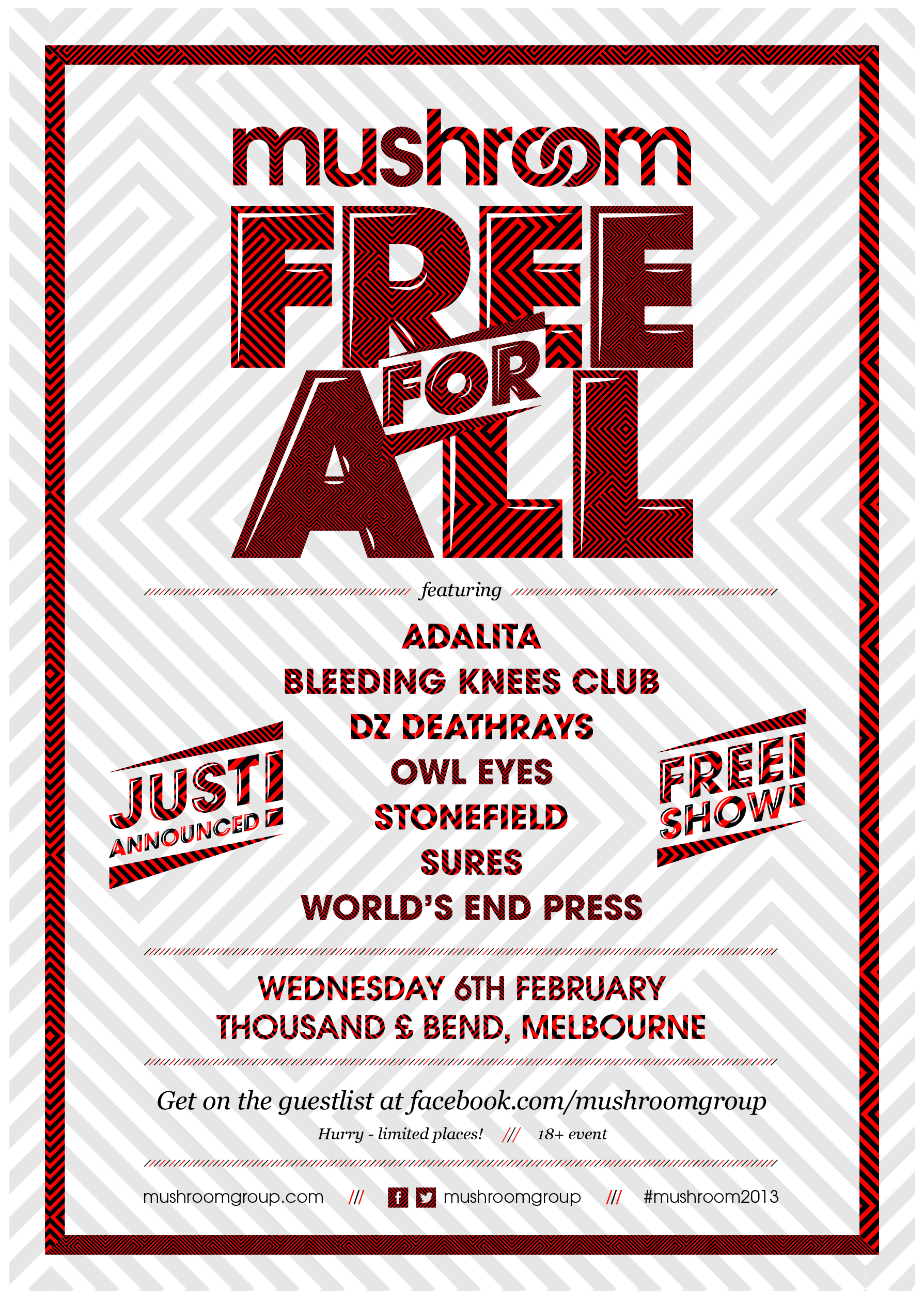 Significantly 2013 will not only be about a re-launch of the Mushroom Group. Celebrating 40 years in the entertainment business, the next twelve months will see Mushroom giving back to the fans that have helped make it the major powerhouse that it is today. First off the ranks will be a free concert event at Melbourne’s 1000 £ Bend on Wednesday 6 February – the Mushroom Free For All featuring Adalita, Bleeding Knees Club, DZ Deathrays, Owl Eyes, Stonefield, SURES, and World End’s Press. 100% subscribed to already through a ballot entry system the event will see close to 500 music fans enjoying a free night of stellar entertainment thanks to Mushroom and its amazing artists. Plans are in overdrive already for similar events to be held across Australia in 2013 as well as a number of other exciting initiatives designed to reconnect Mushroom with both new and past generations of music fans.
