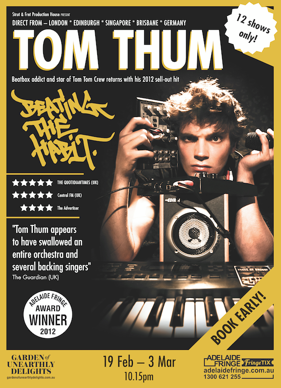 Beatbox addict and star of Tom Tom Crew, Tom Thum returns with his 2012 sell-out Fringe hit Beating The Habit. Winner Underbelly Edinburgh Award – Adelaide Fringe 2012. Since his award-winning debut at Adelaide Fringe last year, Thum has been invited to tours in London, Edinburgh, Brisbane, Germany, and Singapore and now he’s returning to Adelaide.