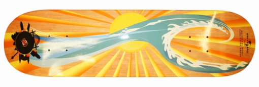 The skateboard is uniquely Australian and celebrates UMPG’s rich musical heritage with a silhouette of the Sydney skyline surrounding a vinyl LP motif. As Australia is home to some of the world’s finest beaches, the deck also features an artistic depiction of a breaking wave superimposed over a blazing sun.