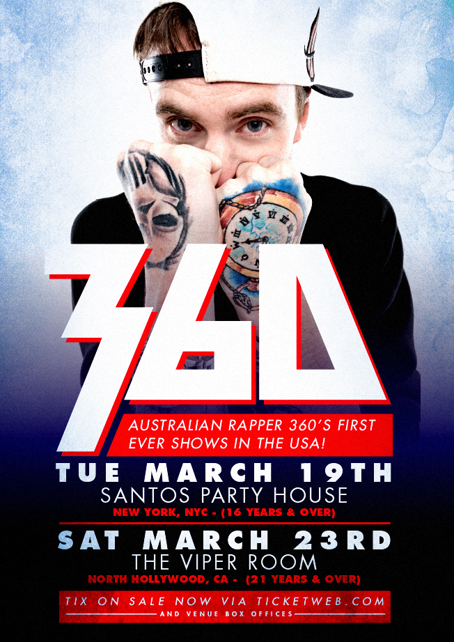 First up Six will be playing three very special showcases as a part of SXSW. OnWednesday March 13, 360 will play the Meduse Lounge in Austin then on Thursday March 14 he will take the stage at The JR, as a part of the official The Agency Group Showcase, and finally on Friday March 15, Six will join a host of other Australian talent playing the Aussie BBQ showcase at Maggie Mays. From Austin 360 will then head to New York City to play his first ever American headline show at the Santos Party House on Monday March 18.