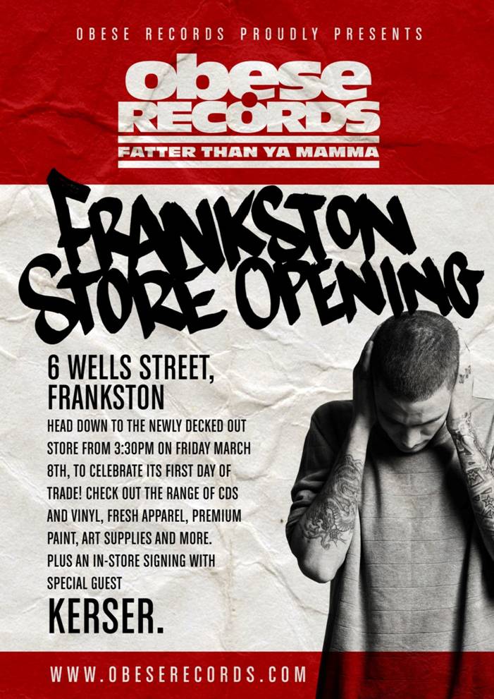 After years of demographic observation, Pegz recognised the demand for a cultural hub in Frankston after noting a large portion of hip hop enthusiasts inhabited the bay side region. The decision was made to replicate a second retail store. Conveniently positioned at the heart of the township, the shop features an impressive wall piece by Melbourne graffiti artist Shem and will be open five days. Business hours are Tues – Sat 10am-5:30pm, and 10am – 6pm on Fridays. Besides vinyl, CDs, and the label’s own merchandise, Obese Records retail will stock street apparel and accessories from brands such as 1Line, Wu Tang, Burn Crew, and Kangol. Quality paints from Ironlak, Molotow will also be available to customers over 18, as well as a wide range of arts supplies, street art magazines and DVDs.