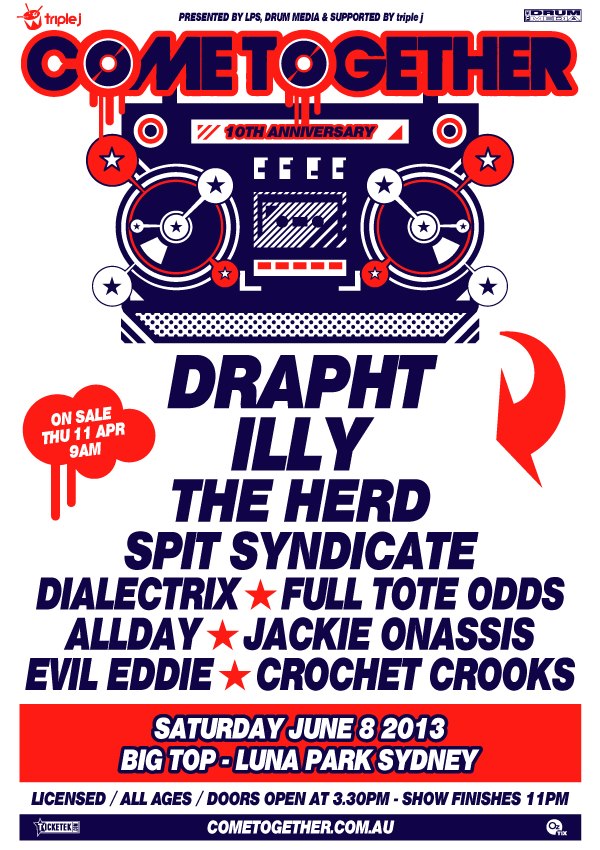 Celebrating its very special 10th anniversary in what is sure to be a night of epic proportions, we are excited to announce that Come Together – the massive all-Aussie hip-hop bash will take place in the Big Top at Luna Park, this Queen’s Birthday long weekend. This year’s stellar line-up of local hip-hop leaders are ready to blow the roof off and be seen as they should be – loud, proud and in your face.