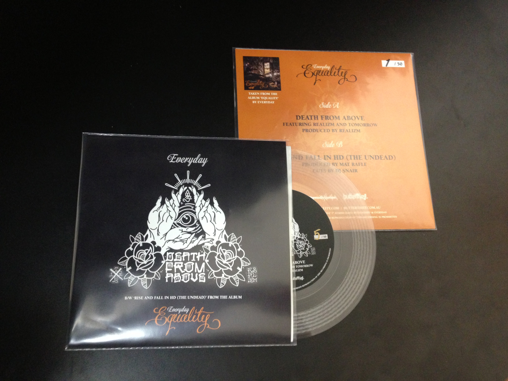 Off the back of his recently released album Equality, Adelaide emcee Everyday is releasing a 7″ to coincide with the album launch that was held on Saturday night at the Butterthief ButterJam, Light Hotel Adelaide. The 7″ features album tracks Death From Above featuring Tomorrow and Realizm (produced by Realizm) on the A Side, and Rise and Fall In HD (The Undead) featuring DJ Snair (produced by Mat Rafle) on the flip.
