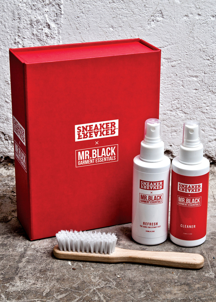 Recently we met Mr Black, famed worldwide for his denim cleaning solution. Together we collaborated on a special formula that delivers unparalleled performance when it comes to cleaning suede, vinyl and mesh. It’s a double-strength, all-natural fluid that dissolves grime and removes scuff marks quick as a wink. The second bottle kills bacteria stone dead and neutralizes stinky foot odours in the process.