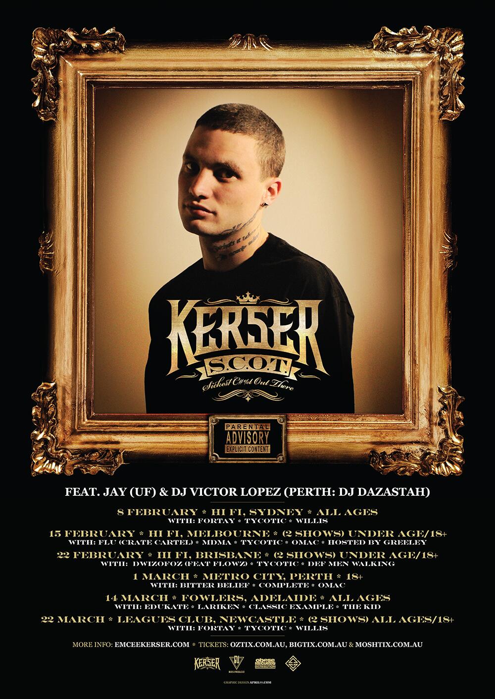 Kerser S.C.O.T. National Tour feat. Jay UF and DJ Victor Lopez* *except Perth with DJ Dazastah: Saturday 8th Feb Hi Fi, Sydney, NSW (All Ages) -Supported by Fortay, Tycotic & Willis Tickets: http://www.oztix.com.au