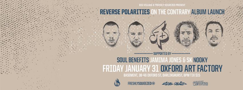 After a prolonged gestation, and increased expectation, Sydney hip hop crew Reverse Polarities – from the Big Village co-operative, and comprising members of the 2013 Australian Music Prize finalists Daily Meds – renowned for politically charged lyrics, rapid fire rhymes and high energy live performance have at last delivered their debut LP On The Contrary.