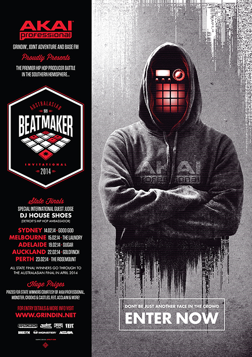 The Australasian Beatmaker Invitational challengers have been selected and will be showcasing their finest beats to a live audience, plus acclaimed local and international judges, including DJ House Shoes (Detroit’s Hip Hop Ambassador), competing for a stack of prizes from sponsors including AKAI Professional, Crooks & Castles, Monster, Acclaim, Feit and more.