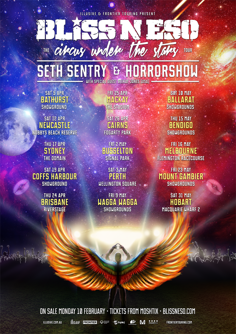 The ‘Circus Under the Stars’ tour will see Bliss N Eso setting up massive customised outdoor stages with state-of-the-art production in each region, taking their explosive live shows outdoors for the first time on a headline tour. This will be a totally new concert experience for each of the 12 regional areas and something that most capital cities will not have seen outside of a festival setting. It’s set to be one to remember.