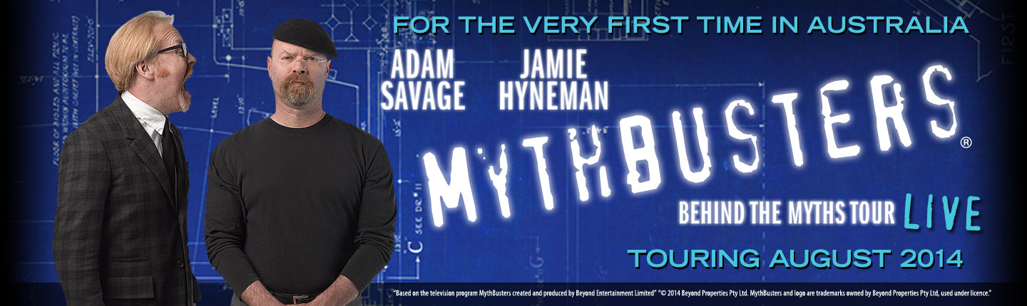 Mythbusters: Behind The Myths presents a fantastical 2 hour evening of on-stage experiments, audience participation, rocking video and behind-the-scenes stories. With this show, for the first time, fans join Hyneman and Savage on stage and assist in their mind-blowing and mind-twisting approach to science.