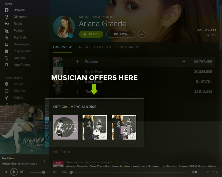 Many artists have chosen to put together special offers for their fans on Spotify through BandPage. Examples include an opportunity to meet Porter Robinson and receive a prop from his Lionhearted video, a one-of-a-kind koozie and t-shirt bundle from Miranda Lambert, a presale and exclusive online concert offer from Ariana Grande, a song collaboration with members of Tea Leaf Green, pre-show soundcheck parties with the Stone Foxes and many more. All of these offers are available on artist profile pages on Spotify beginning today.